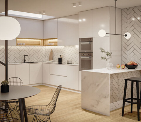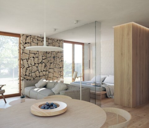 Es tiempo de casas modulares. 40 m2 dan para mucho. Piedra, blanco…